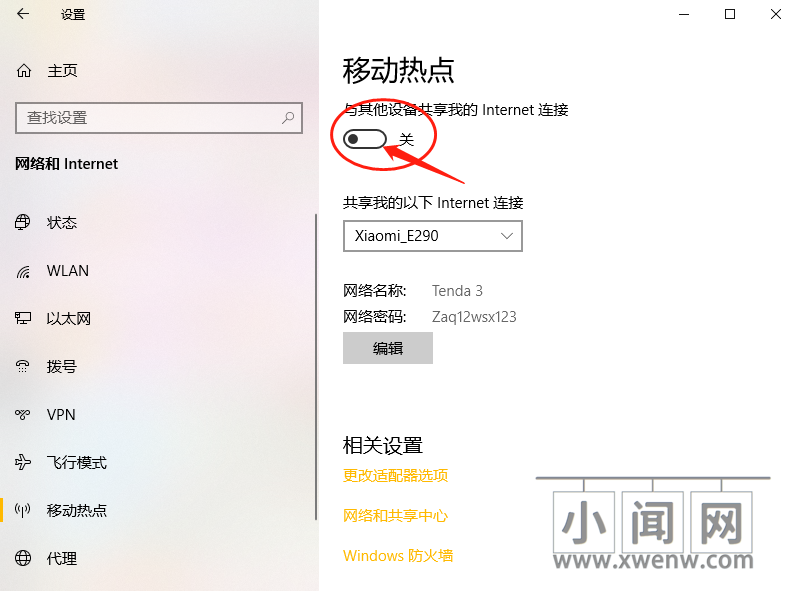 4、打开“与其他设备共享我的 Internet 连接”。